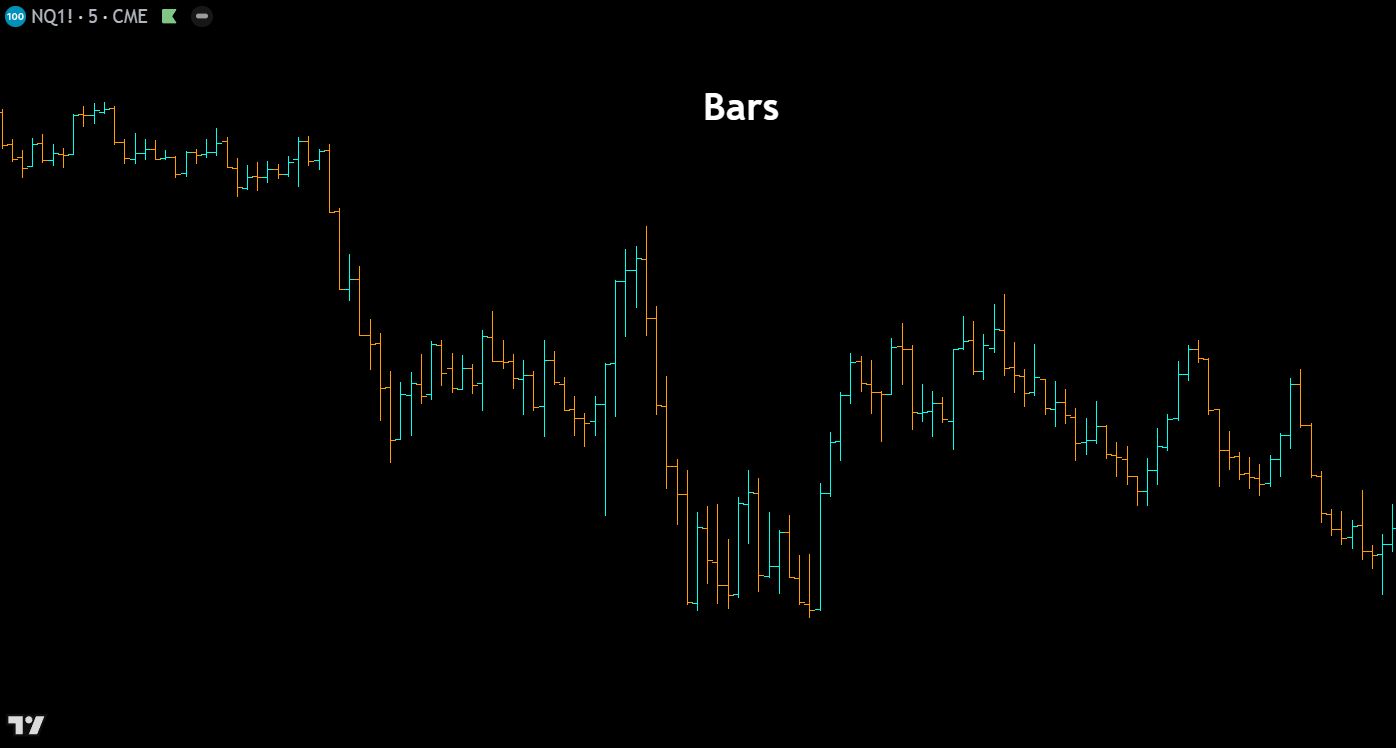 Bars – Bar charts display each period’s price action as a vertical line spanning the high to low, with small horizontal ticks marking the open (left) and close (right). This minimalist format reduces visual clutter compared to candlesticks, making it a favorite among seasoned traders who want clean price data without the distraction of filled candle bodies. Bars are particularly useful when analyzing dense charts with many periods on screen.