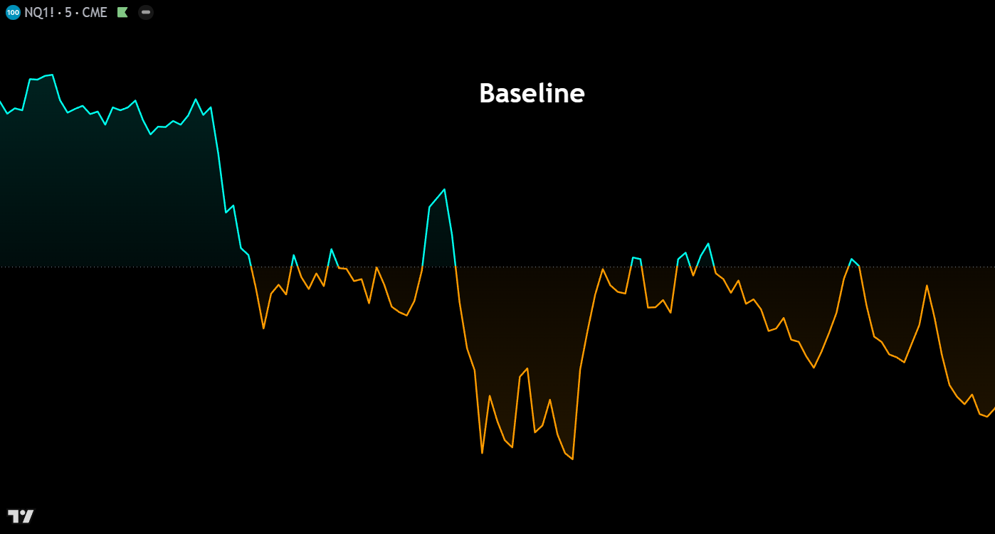 Baseline – The baseline chart plots closing prices as a line and fills the area between the price and a user-defined reference level (the baseline). Price above the baseline is shaded one color (typically green), while price below is shaded another (typically red). This format makes it immediately obvious when an instrument is trading above or below a key level — such as a moving average, VWAP, or a specific price — making it an excellent tool for mean-reversion strategies and relative performance analysis.