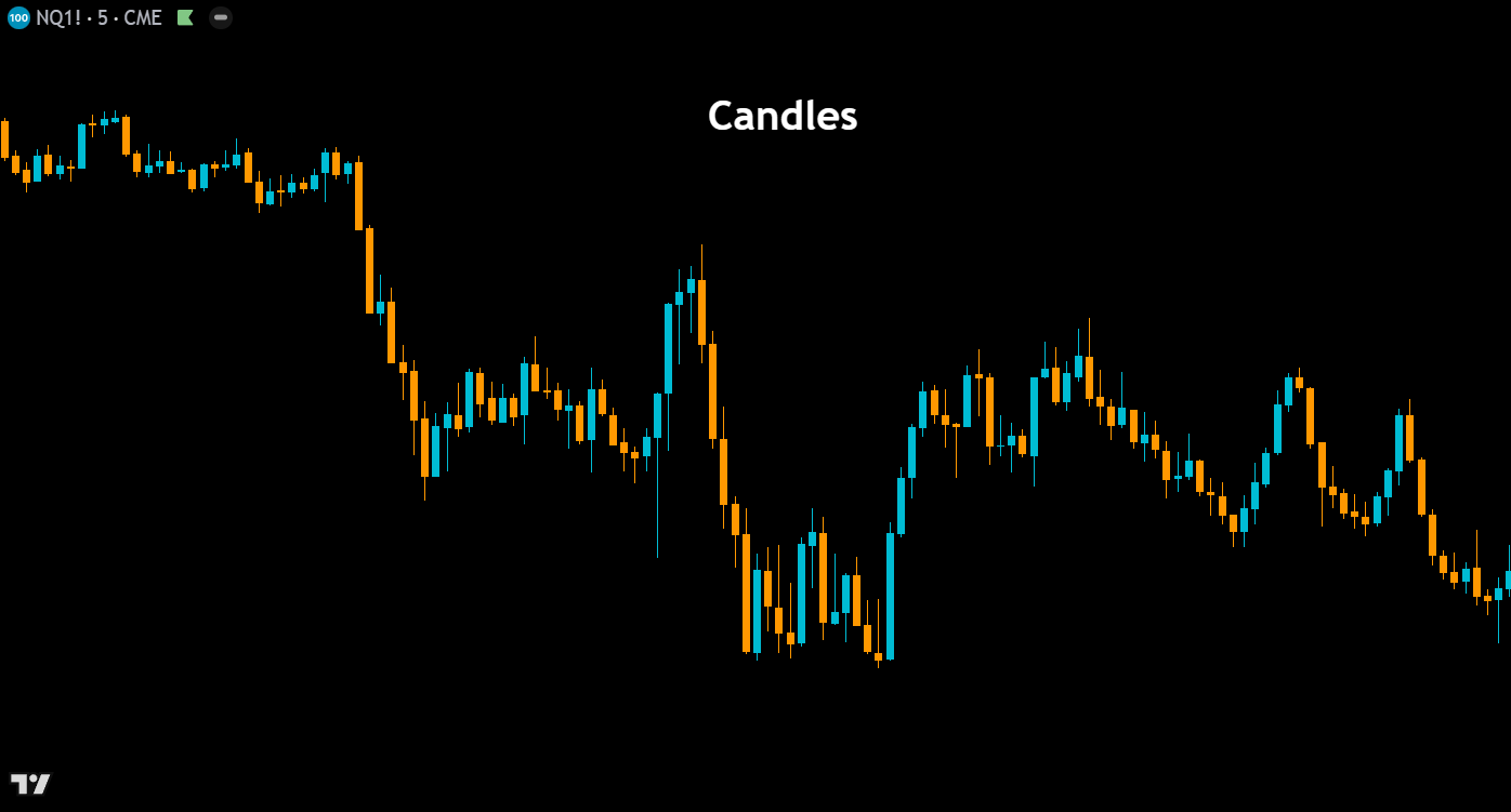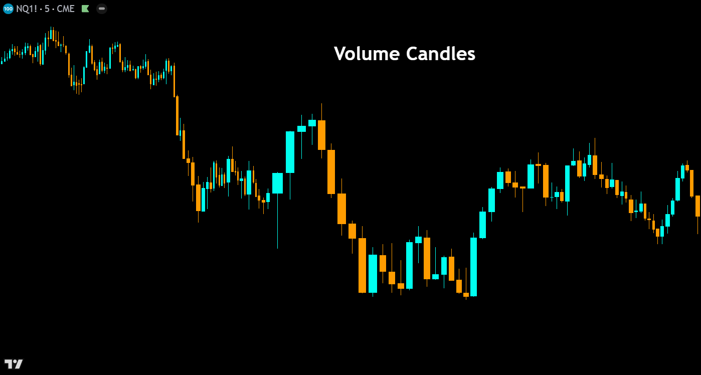 Volume Candles – Volume candles modify the width of each candlestick body based on the volume traded during that period. High-volume bars appear wider, while low-volume bars appear narrower, creating an intuitive visual link between price action and participation, similar to our order flow candles indicator. This chart type helps traders instantly identify which price moves were backed by conviction and which occurred on thin volume — a critical distinction when evaluating the strength of breakouts, reversals, and trend continuations.