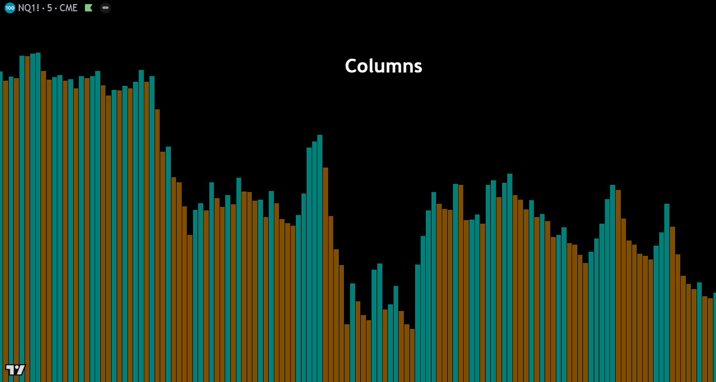 Columns – The columns chart displays each period’s closing price as a vertical bar extending from the zero line, colored based on whether the close was above or below the previous close. While not commonly used for direct price analysis on instruments trading far from zero, this chart type is highly effective for visualizing oscillators, volume data, and other indicators where the relationship to a zero or baseline level is the primary focus of analysis.