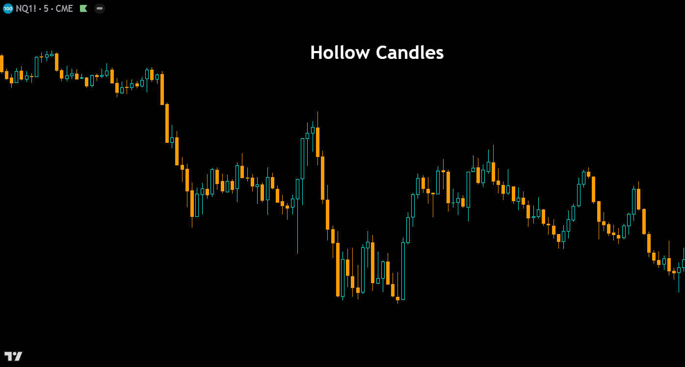 Hollow Candles – Hollow candles add an extra layer of information to traditional candlesticks by encoding both the open-to-close relationship and the close-to-previous-close relationship into a single candle. A hollow (unfilled) body indicates the close is above the open, while a filled body means the close is below the open. The color then reflects whether the current close is above or below the previous close. This dual-encoding system gives traders a faster read on both intrabar and interbar momentum at a glance.