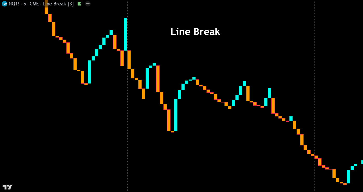 Line Break – Line break charts (also called three-line break charts) plot a series of vertical blocks based on closing prices, adding a new block only when the close exceeds the high or low of the previous N blocks (typically three). If price doesn’t break beyond these reference points, no new block is drawn. This creates a chart that naturally filters out minor price movements and only reacts to meaningful reversals, making it a powerful tool for identifying trend changes and eliminating whipsaws in choppy markets.