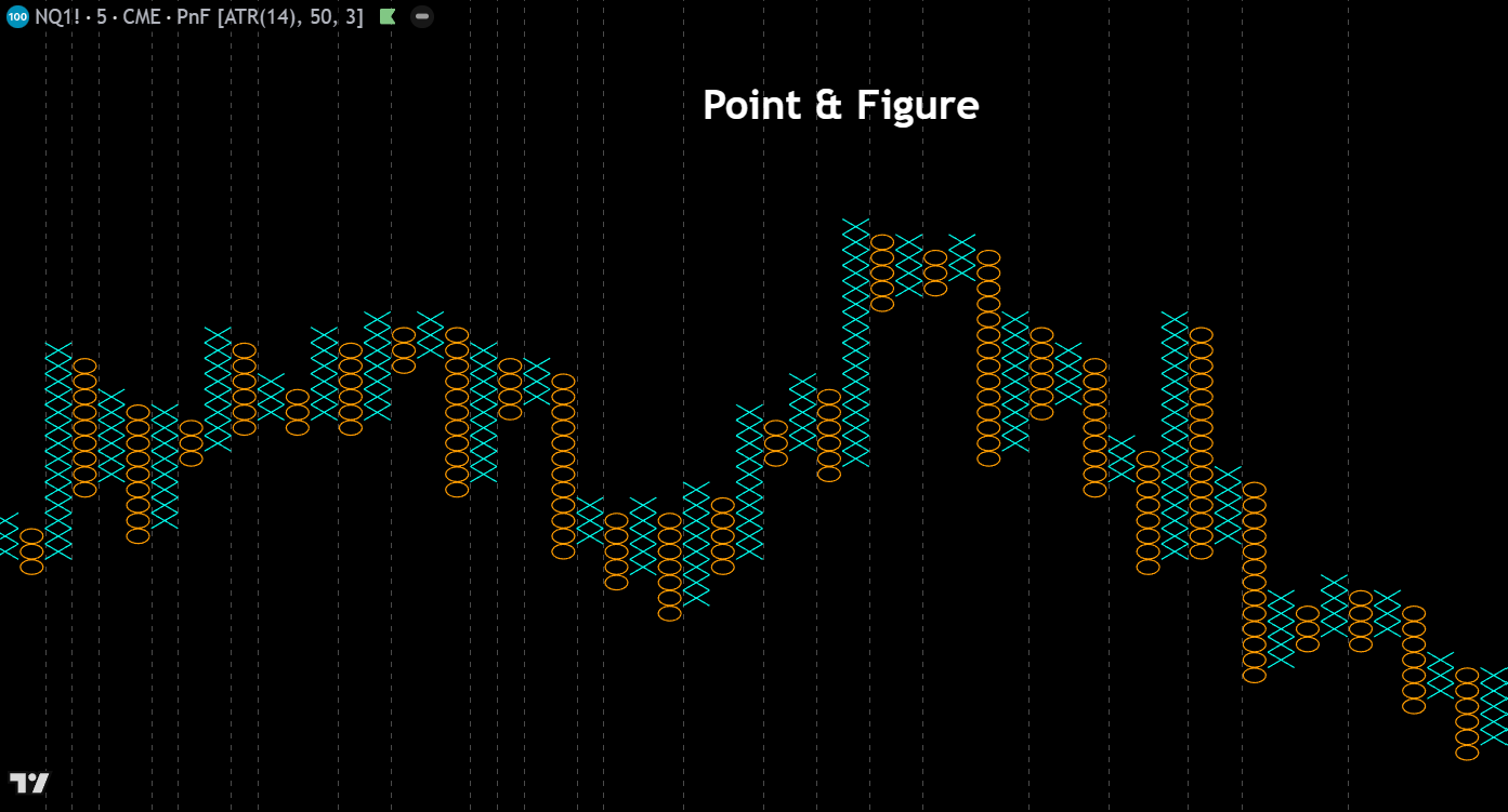 Point & Figure – Point & Figure charts plot columns of X’s (rising prices) and O’s (falling prices) based purely on price movement, with each symbol representing a defined price increment (box size). A new column begins only when price reverses by a set number of boxes (typically three). By eliminating time and focusing solely on price, P&F charts produce clean formations ideal for calculating precise price targets, identifying breakouts, and drawing trendlines. They remain a favorite among classical chartists for their objectivity and the clarity of their buy and sell signals.