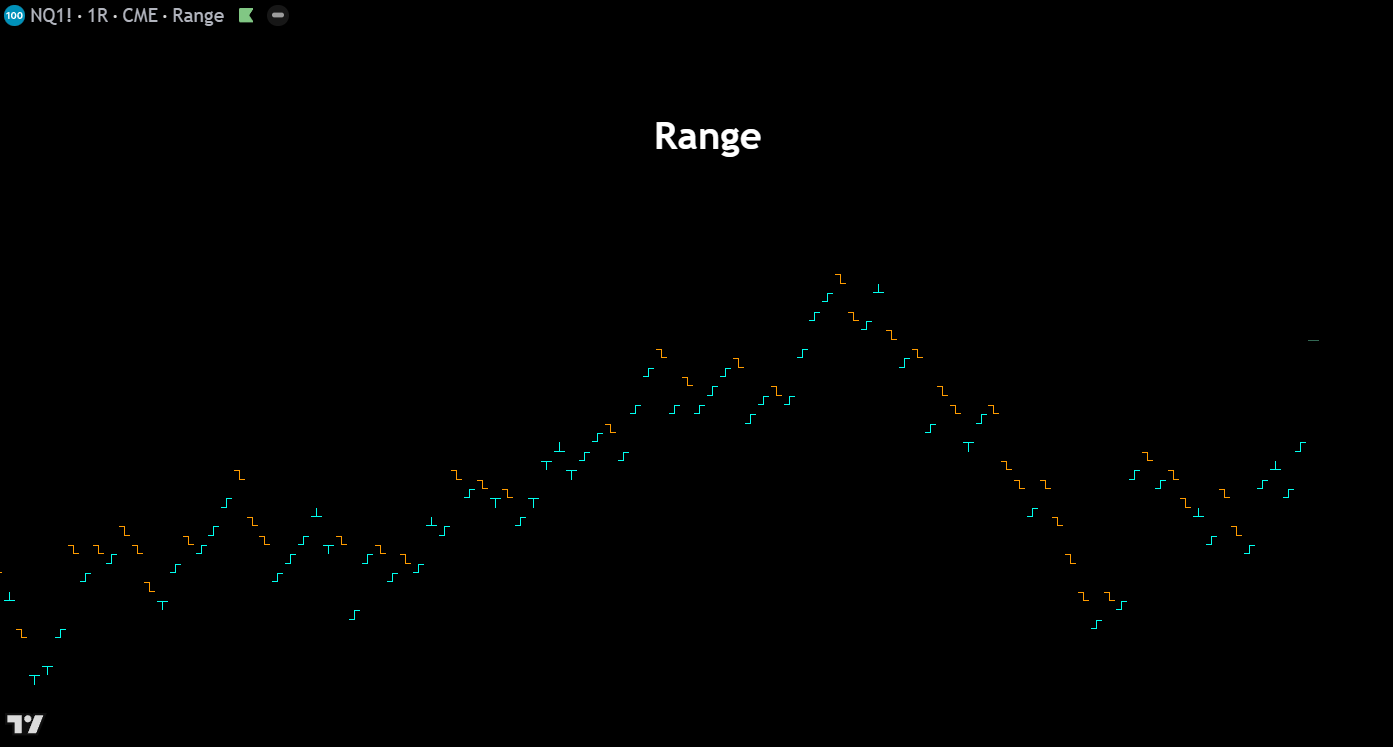 Range – Range charts create a new bar only when price has traversed a user-specified number of ticks or points, regardless of how much time has elapsed. Each bar represents an equal unit of price movement, which normalizes volatility and produces consistent bar sizes across all market conditions. During high-volatility periods bars form rapidly, while quiet markets generate very few bars. Range charts are popular among day traders and scalpers because they eliminate time-based noise and keep the focus on actual price movement and market participation.