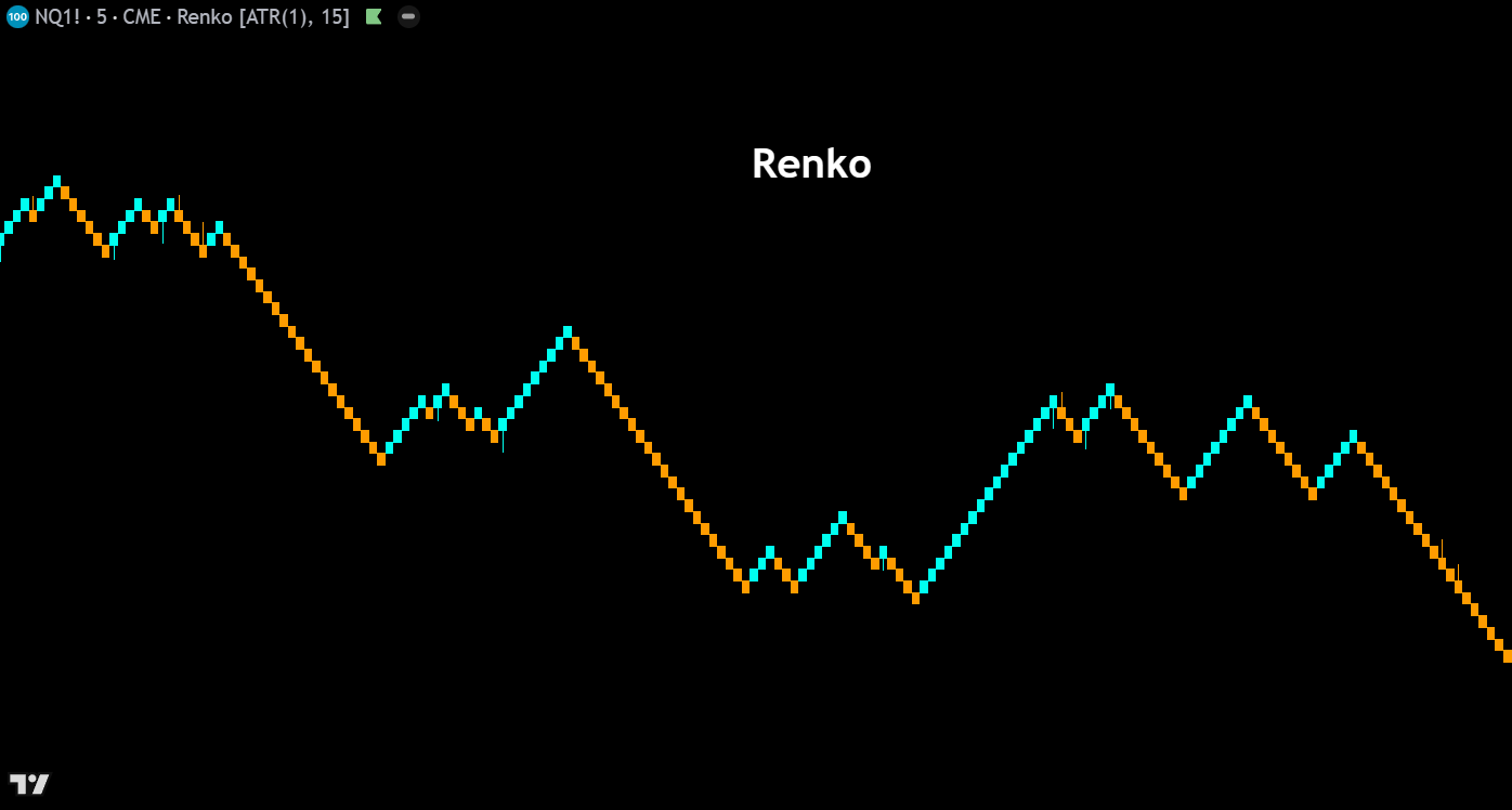 Renko – Renko charts are constructed entirely from price movement, ignoring time altogether. A new “brick” is added to the chart only when price moves a specified amount in one direction, creating uniform blocks that clearly highlight trends and filter out minor fluctuations. Bullish bricks print in one color, bearish in another, and reversals require price to move twice the brick size in the opposite direction. Renko charts are valued by swing traders for their ability to define clean trends, reduce noise, and generate straightforward support and resistance levels.