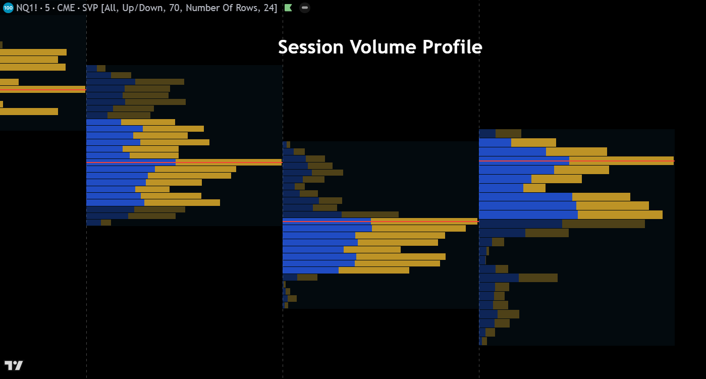 Session Volume Profile – The session volume profile overlays a horizontal histogram on each trading session, showing the volume traded at each price level throughout the day. This provides a visual map of where the most and least activity occurred within a session, clearly identifying the point of control, value area high, and value area low. Traders use session volume profiles to locate institutional accumulation and distribution zones, find high-probability support and resistance levels, and understand the context of current price relative to the day’s auction.