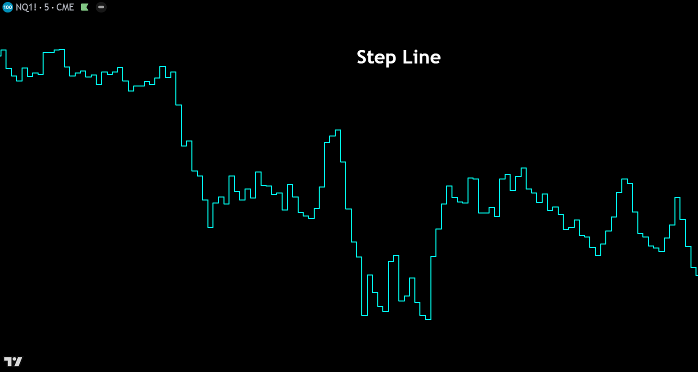 Step Line – The step line chart connects closing prices using horizontal and vertical segments rather than diagonal lines, creating a staircase-like appearance. Each price level is held flat until the next period’s close prints, at which point the line jumps vertically to the new level. This format clearly emphasizes the magnitude and timing of price changes, making it useful for identifying consolidation zones where price remains flat and breakout moments where price shifts sharply to a new level.