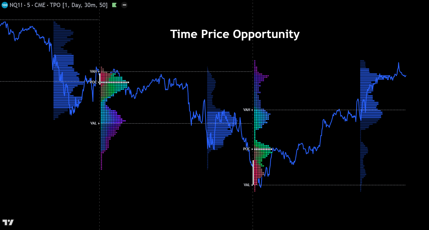 Time Price Opportunity (TPO) – Time Price Opportunity charts, also known as Market Profile, organize price data by the amount of time spent at each price level rather than by volume. Each time increment is represented by a letter or block, building horizontal rows that form a bell-curve distribution over a session. The resulting profile highlights the value area where the majority of trading time occurred, the point of control (most visited price), and the single prints that indicate fast directional moves — all critical concepts for auction-based market analysis.