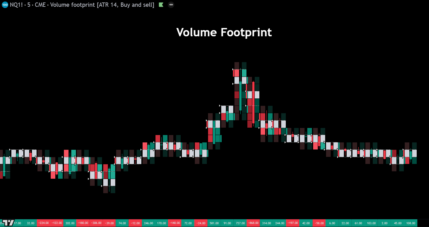 Volume Footprint – The volume footprint chart breaks down each candle into price levels and displays the volume traded at the bid and ask at each level within the bar. This granular view reveals the internal auction dynamics hidden inside a standard candlestick — showing where aggressive buyers and sellers were active, where imbalances occurred, and where volume was concentrated. Footprint charts are an essential tool for orderflow traders who need to understand the “why” behind price movement, not just the “what.”